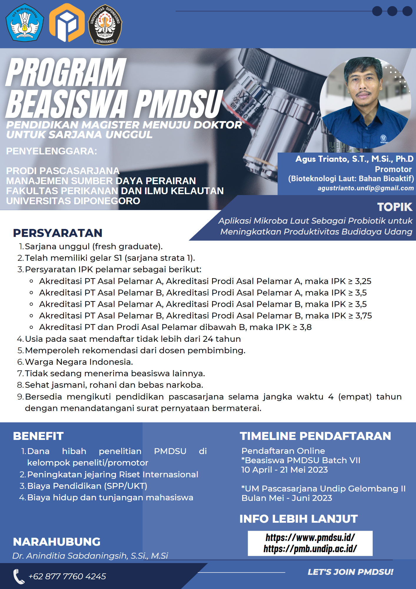 Registration for the 2023 Masters to Doctoral Education Scholarship Program for Superior Undergraduates (PMDSU) Batch VII is officially open. The Postgraduate Study Program in Aquatic Resources Management is also the organizer of the PMDSU Scholarship Program with Promoter Agus Trianto, S.T., M.Sc., Ph.D. with expertise in Marine Biotechnology: Bioactive Ingredients. The research topic to be conducted is entitled Application of Marine Microbes as Probiotics to Increase the Productivity of Shrimp Aquaculture.