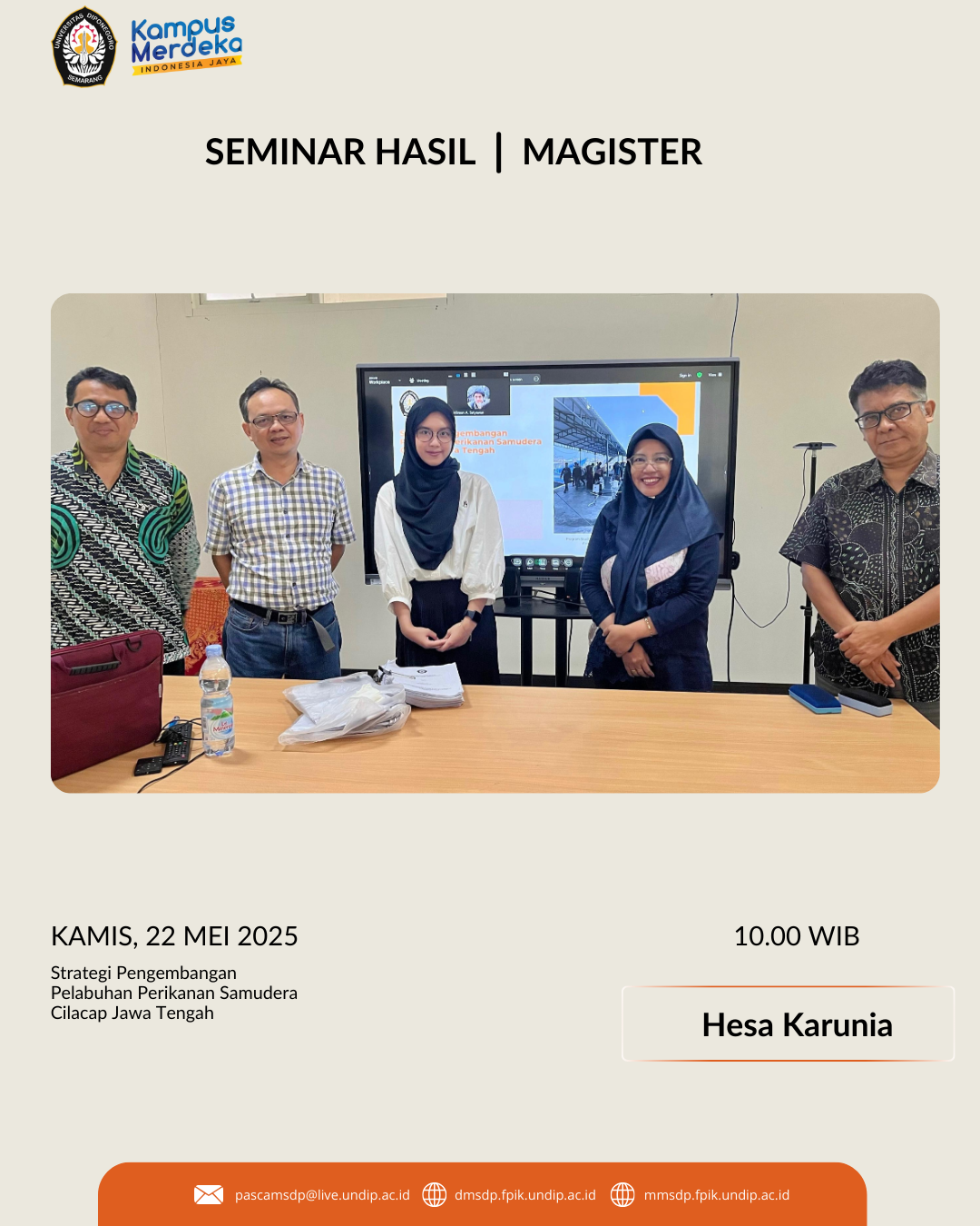 The research results seminar activity of the Masters Program in Aquatic Resources Management, FPIK, Diponegoro University by Ms. Hesa entitled “Development Strategy for the Cilacap Ocean Fishing Port, Central Java”. The research results seminar was attended by Prof. Dr. Dian Wijayanto, S.Pi., M.M., M.S.E. (Supervisor 1), Dr. Abdul Kohar Mudzakir, S.Pi., M.Si. (Supervisor 2), Dr. Trisnani Dwi Hapsari, S.Pi, M.Si (Examiner), Dr. Ir. Bambang Argo Wibowo, M.Si (Examiner), Dr. Aninditia Sabdaningsih, S. Si., M. Si. (Manager) and colleagues of the Masters Program who provided encouragement. Based on the research results seminar that has been presented, Ms. Hesa Karunia can proceed to the next stage, namely the Thesis Examination by completing several improvements and suggestions that have been given by the examiners and supervisors and colleagues. Keep up the spirit and good luck!