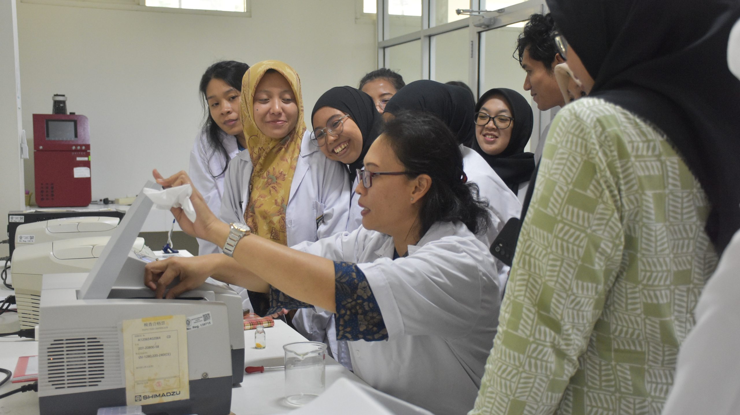 Softskills training “Isolation and identification of pigments from marine natural materials” with instructor Dr. Lia Kusmita, S.Si., M.Si from the Semarang Pharmasi Foundation College of Pharmacy. The activity begins with an explanation from the instructor regarding the topic; Extraction of marine ingredients used spirulina and seaweed; then fractionation is carried out; Isolation by thin layer chromatography (TLC). The isolates that have been obtained proceed to isolate identification using UV-Vis spectrophotometry for analysis of UV and Visible wavelengths as an absorption area for detecting compounds that have a low detection limit and have a high level of accuracy and precision.