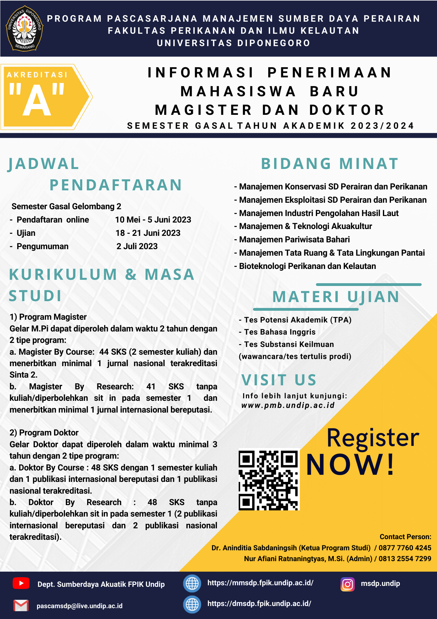 Seleksi Ujian Mandiri (UM) Program Pascasarjana Magister dan Doktor (S2 – S3) dan Program Profesi periode Semester Gasal Gelombang 2 Universitas Diponegoro Tahun Akademik 2023/2024 telah dibuka.
