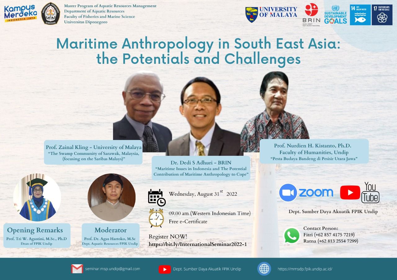 The Department of Aquatic Resources, Faculty of Fisheries and Marine Sciences, Universitas Diponegoro (FPIK UNDIP) has held an International Seminar with the theme: “Maritime Anthropology in South East Asia, the Potential and Challenge” This online seminar was held virtually (via Zoom Meeting and Live Streaming on YouTube Channel Dept. Sumberdaya Akuatik). This session be held on Wednesday, August 31st 2022 | 09.00 – 12.00 WIB (Western Indonesia Time) Registration https://bit.ly/InternationalSeminar2022-1 Opening Remarks: Agus Triyanto, ST., M.Si., Ph.D – Vice Dean I FPIK Undip Speaker I: Prof. Zainal Kling – University of Malaya Speaker II: Dr. Dedi Supriadi Adhuri – BRIN Speaker III: Prof. Nurdien H. Kristanto, Ph.D – Faculty of Humanities Undip Moderator: Prof. Dr. Agus Hartoko, M.Sc – Department of Aquatic Resources FPIK Undip Facilities E-Certificate and materials, useful knowledge, and networking Stay Healthy and Productive, guys!