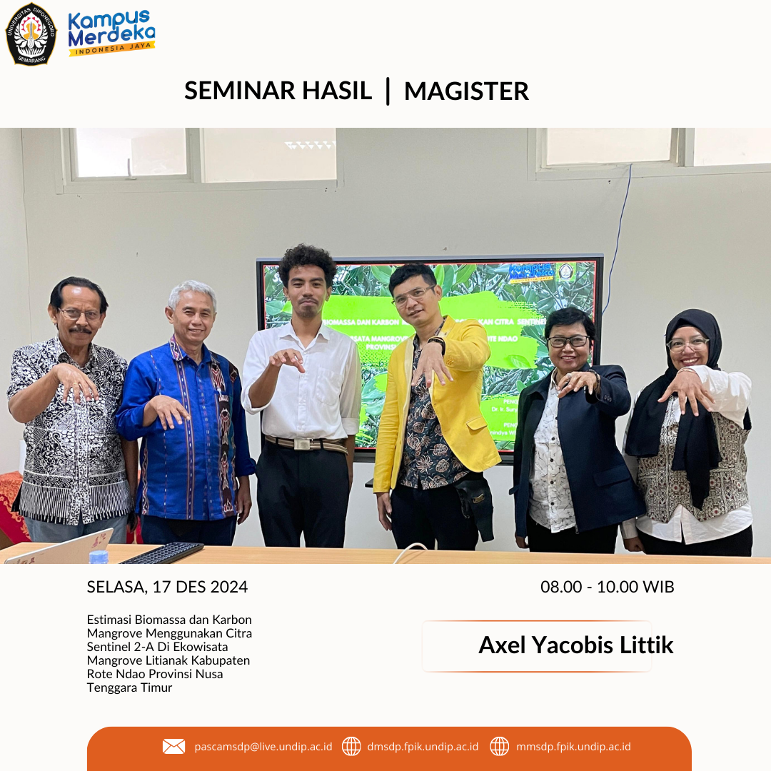 Seminar Hasil tesis yang berjudul “Estimasi Biomassa dan Karbon Mangrove Menggunakan Citra Sentinel 2-A Di Ekowisata Mangrove Litianak Kabupaten Rote Ndao Provinsi Nusa Tenggara Timur”. Ujian ini dihadiri oleh Prof. Dr. Ir. Agus Hartoko, M.Sc (Pembimbing 1), Ir. Max Rudolf Muskananfola, M.Sc, Ph.D (Pembimbing 2), Prof. Dr. Sc. Anindya Wirasatria, S.T., M.Si., M.Sc. (Penguji), Dr. Ir. Suryanti, M.Pi (Penguji), Dr. Aninditia Sabdaningsih, M.Si (Pengelola) dan rekan-rekan mahasiswa. Berdasarkan ujian seminar hasil yang telah dipaparkan, saudara Axel diberikan kritik, saran dan masukan untuk hasil penelitian yang dibahas. Tetap semangat ke tahap selanjutnya yaitu Ujian tesis dengan beberapa catatan yang perlu diperbaiki dan ditambahkan. Semoga sukses!