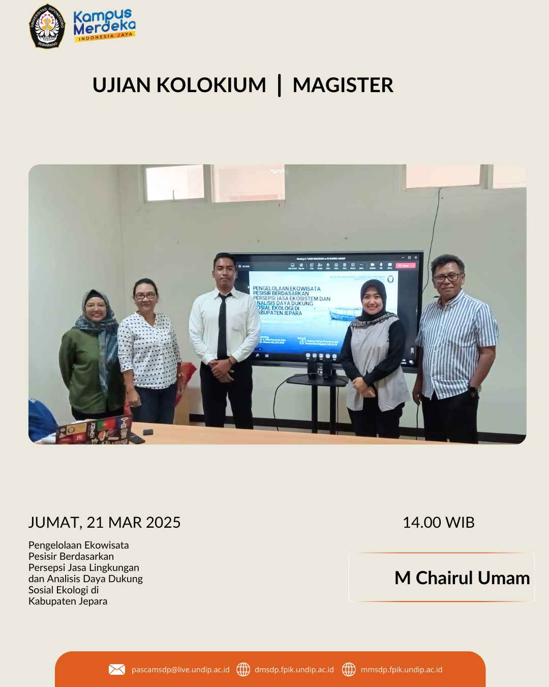 Judul proposal tesis yang diajukan adalah “Pengelolaan Ekowisata Pesisir Berdasarkan Persepsi Jasa Lingkungan dan Analisis Daya Dukung Sosial Ekologi di Kabupaten Jepara”. Pada pemaparannya menjelaskan mulai dari tujuan penelitian, latar belakang pengambilan topik, metode dan analisis data yang akan digunakan hingga timeline penelitian tesis. Ujian dihadiri oleh Dr. Ir. Frida Purwanti, M.Sc (Pembimbing 1), Dr. Churun Ain, S.Pi, M.Si (Pembimbing 2), Dr. Ir. Pujiono Wahyu Purnomo, M.S. (Penguji), Dr. Trisnani Dwi Hapsari, S.Pi, M. Si (Penguji), Dr. Aninditia Sabdaningsih, S.Si., M.Si (Pengelola) serta rekan-rekan Program magister lainnya. Berdasarkan ujian kolokium proposal tesis yang telah dipaparkan oleh saudara Umam mendapatkan banyak saran serta masukan untuk lanjut ke tahap selanjutnya. Tetap semangat dan semoga sukses!