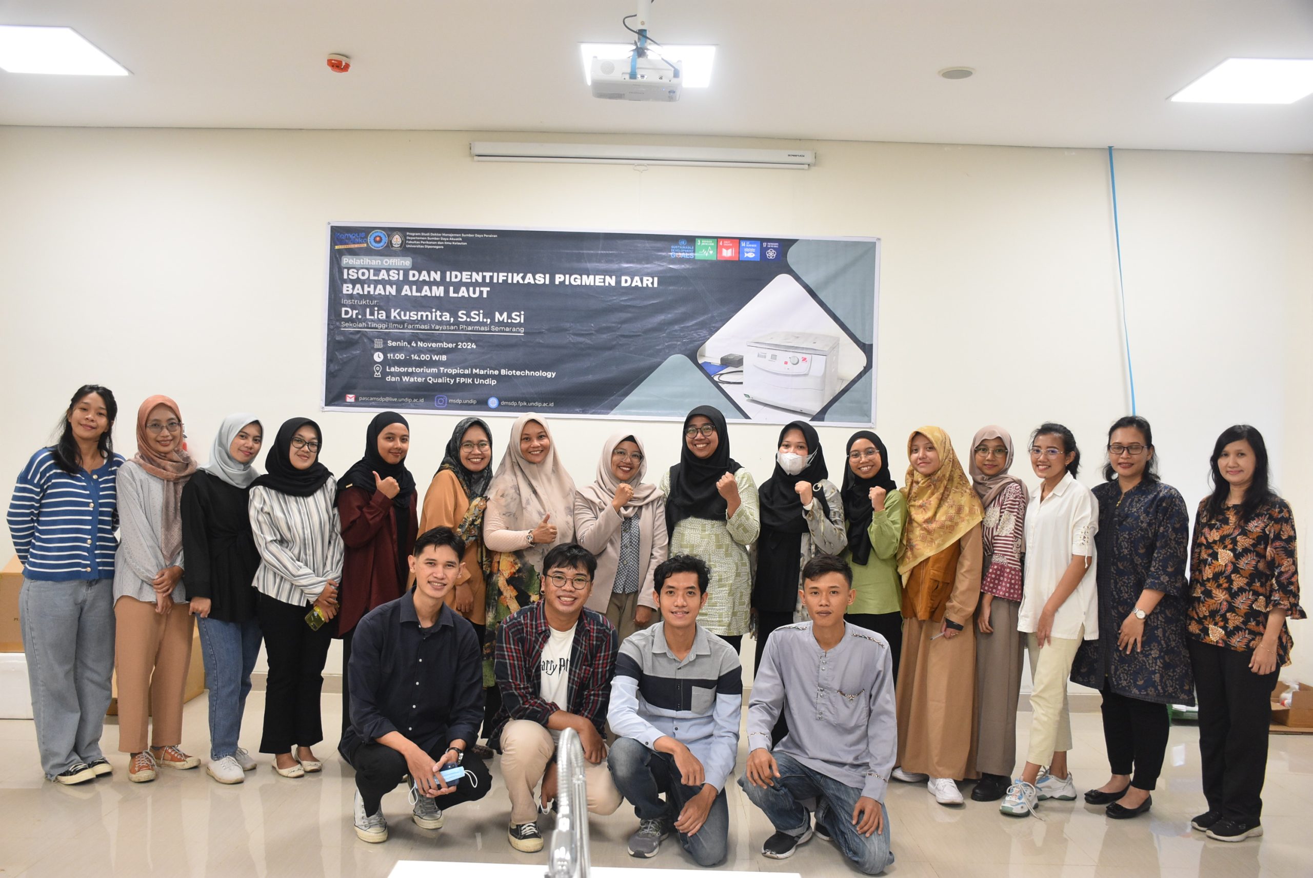 Pelatihan dilaksanakan pada Senin, 4 November 2024 pukul 11.00 – 15.00 WIB di Laboratorium Water Quality Gedung H107 FPIK Undip untuk ektraksi pigmen, Laboratorium Tropical Marine Biotechnology Gedung J201 FPIK Undip untuk identifikasi. Peserta pelatihan terdiri dari 4 kelompok (16 peserta) dari mahasiswa S1,S2 maupun S3 Manajemen Sumber Daya Perairan dan Ilmu Kelautan FPIK Undip.